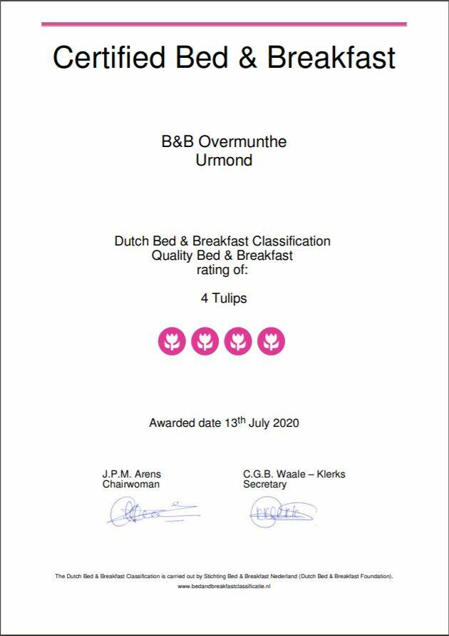 Wij zijn sinds 13 Juli 2020 officieel ingedeeld in de klasse van vier tulpen. Dit is de één na hoogste kwaliteitsklasse van het Nederlandse classificatiesysteem voor bed & breakfasts. Wij ontvingen de vier tulpen na een bezoek van een mystery guest van Stichting Bed & Breakfast Nederland.